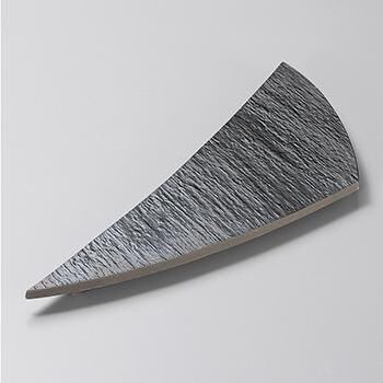 陶器の整形方法の一つにたたら造りというものがあります。粘土を板状に伸ばして造る、半手造りの手法です。こちらは表面を石目を施してあり、渋くかつ高級感のある風合いに仕上がっています。配膳もしやすいように三つの足が付けてあり、持ち上げやすくなっております。