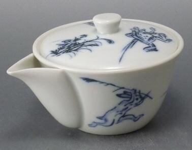 高山寺に伝わる国宝絵巻物。日本最古の漫画とも言われる「鳥獣戯画」。愛嬌たっぷりの動物たちを絵付けしました。こちらは玉露などを淹れるほうひん(手のない急須のようなもの)です。図柄は喧嘩の図です。