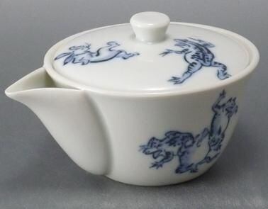 高山寺に伝わる国宝絵巻物。日本最古の漫画とも言われる「鳥獣戯画」。愛嬌たっぷりの動物たちを絵付けしました。こちらは玉露などを淹れるほうひん(手のない急須のようなもの)です。図柄は相撲の図です。