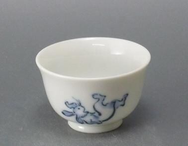 高山寺に伝わる国宝絵巻物。日本最古の漫画とも言われる「鳥獣戯画」。愛嬌たっぷりの動物たちを絵付けしました。こちらは小さめの煎茶になります。図柄は相撲の図です。