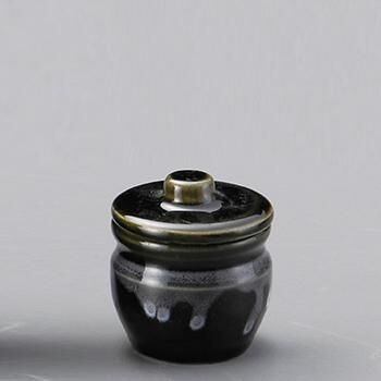 昔ながらの雰囲気で、日本人の感覚にあった色の釉薬を使用しています。こちらはかなり小さく、蓋を取り爪楊枝(つまようじ)入れにしたり、辛子やわさび入れ、珍味入れ等に利用されています。