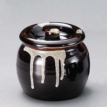 渋い風合いのツボです。本体が一部カットされているのでスプーンなどを差し込むこともできます(スプーンが大きいとうまくはまらない場合があります)。