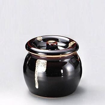 渋い風合いのツボです。本体が一部カットされているのでスプーンなどを差し込むこともできます(スプーンが大きいとうまくはまらない場合があります)。